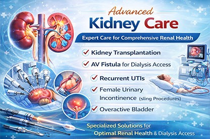 Dr. Paras Singhal specializes in Kidney Transplantation and AV Fistula creation for dialysis access. His clinic expertly manages Recurrent UTIs, Female Urinary Incontinence (Sling procedures), and Overactive Bladder using advanced Cystoscopy and Endourology, ensuring precise, personalized results.